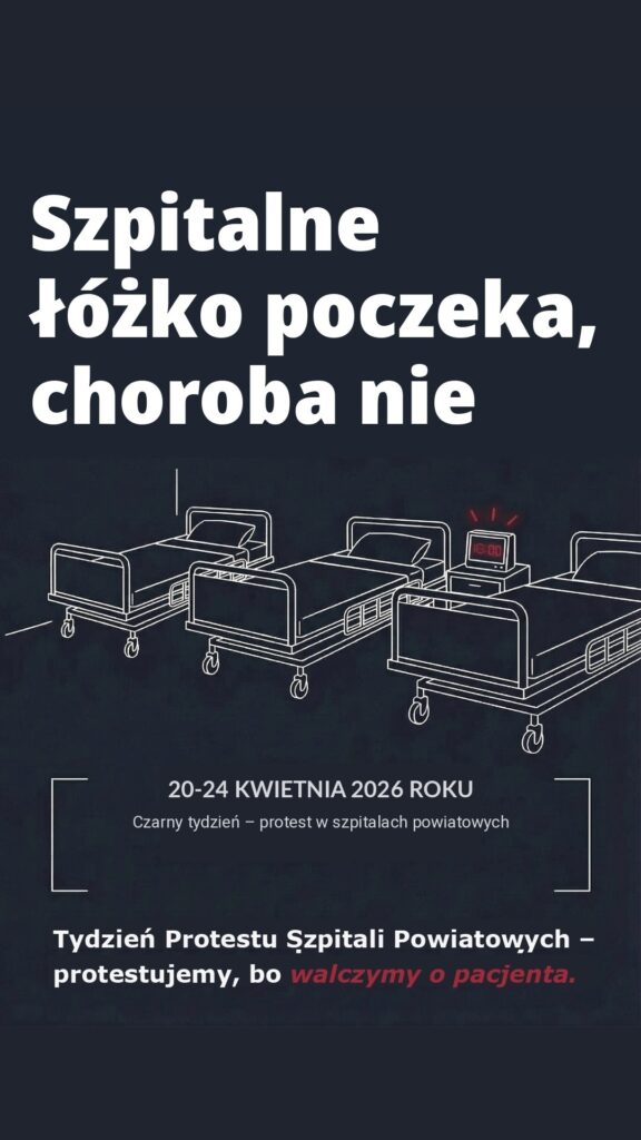 Czarny tydzień – protest w szpitalach powiatowych | 20-24 kwietnia 2026 Tydzień protestu określany jako ,,Czarny tydzień’’ planują dyrektorzy szpitali powiatowych. Hasło przewodnie protestu to: ,,Szpitalne łóżko poczeka, choroba nie!’’. Protest ma być wyrazem sprzeciwu wobec coraz trudniejszej sytuacji finansowej i systemowej placówek. Jak zapewniają organizatorzy, celem protestu jest pokazanie, że obecna polityka finansowania ochrony …